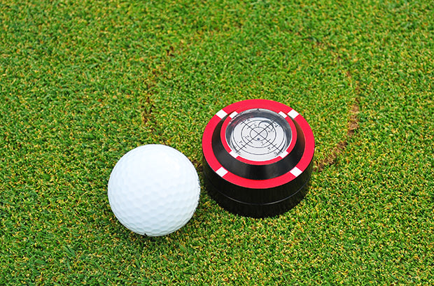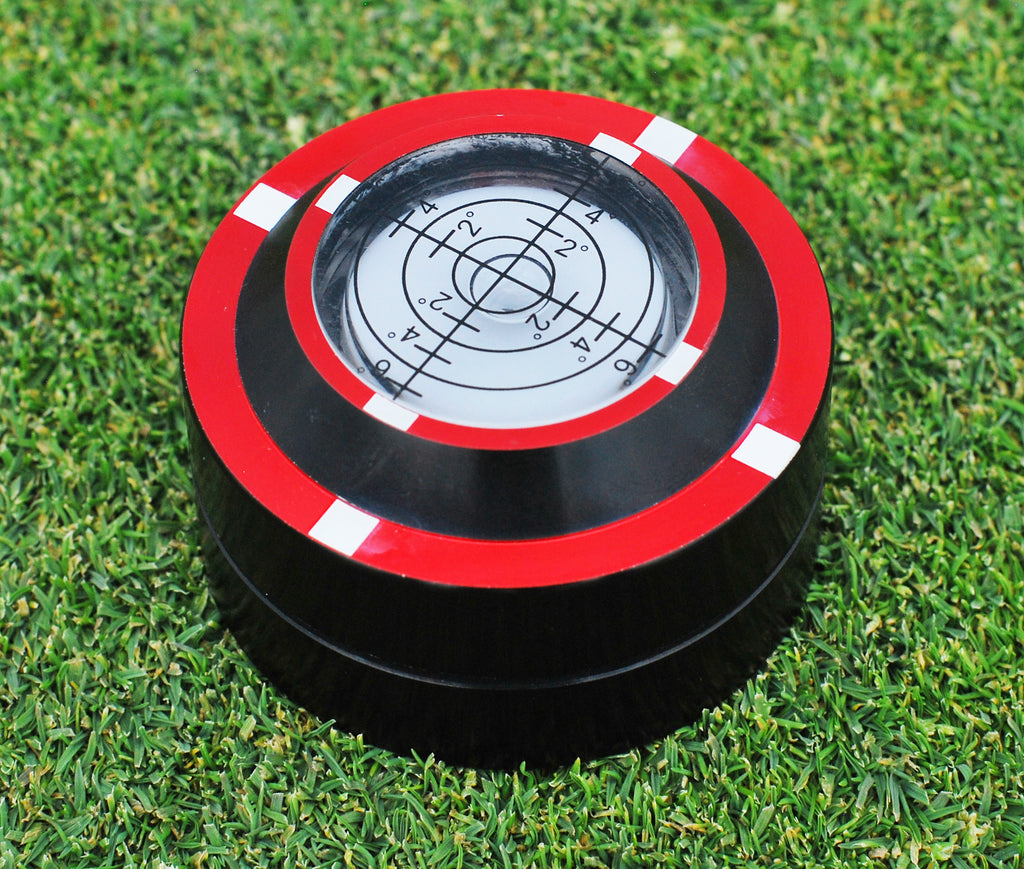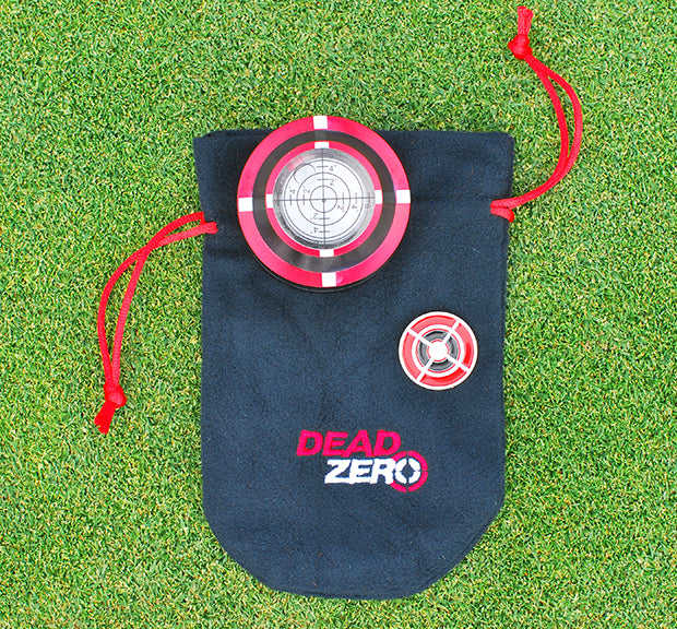 The Dead Zero Pro Putting Disk includes a bubble level on top of the precision milled and anodized disk that measures up to 6-degrees of slope. The Pro model also comes with a bulls-eye patterned ball marker and an embroidered pouch for convenient storage.